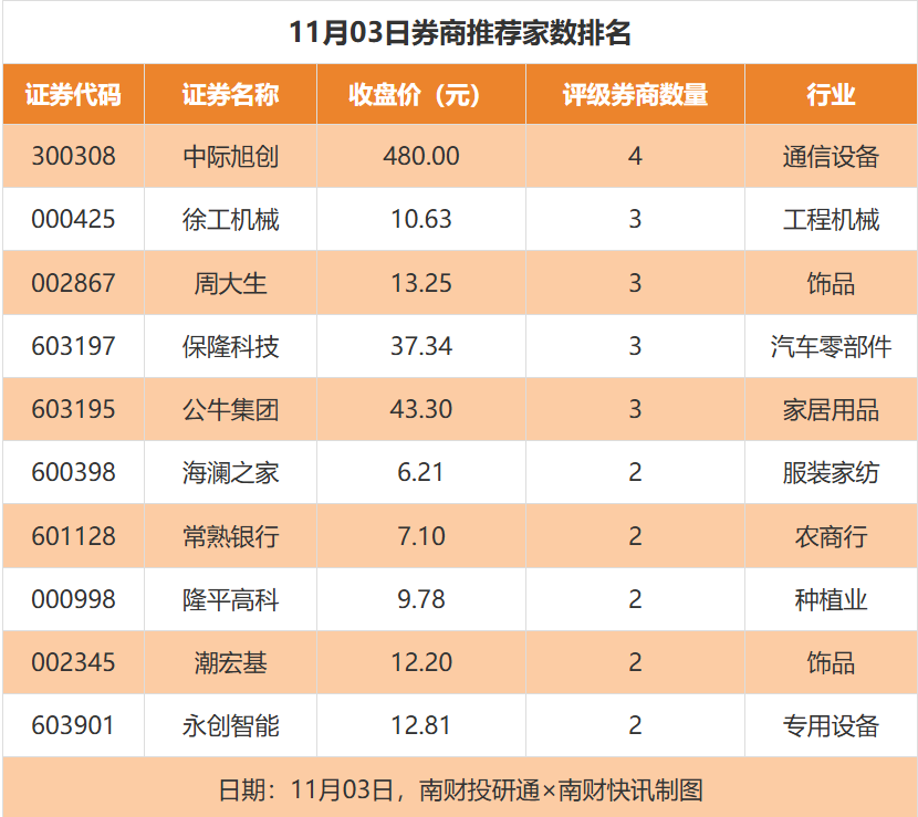 从券商推荐家数来看,11月3日有231家上市公司得到券商推荐,其中中际旭创获得4家推荐,徐工机械获得3家推荐,周大生获得3家推荐。