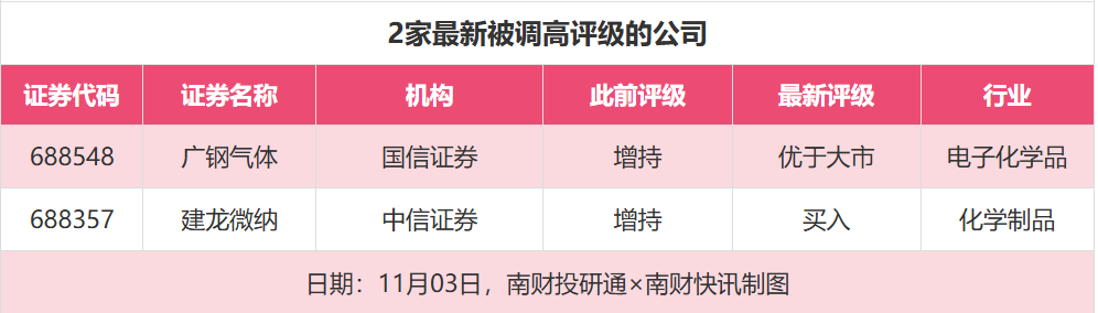 评级调高方面,11月3日,券商调高上市公司评级达到2家次,最新数据包括了国信证券对广钢气体的评级从“增持”调高至“优于大市”,中信证券对建龙微纳的评级从“增持”调高至“买入”。