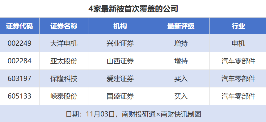 首次覆盖方面,11月3日券商共给出了4次首次覆盖,其中大洋电机获得兴业证券给予“增持”评级专业提供股票配资,亚太股份获得山西证券给予“增持”评级,保隆科技获得爱建证券给予“买入”评级,嵘泰股份获得国盛证券给予“买入”评级。