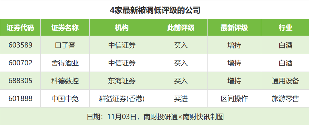 评级调低方面,11月3日,券商调低上市公司评级达到4家次,最新数据包括了中信证券对口子窖、舍得酒业的评级从“买入”调低至“增持”,东海证券对科德数控的评级从“买入”调低至“增持”。
