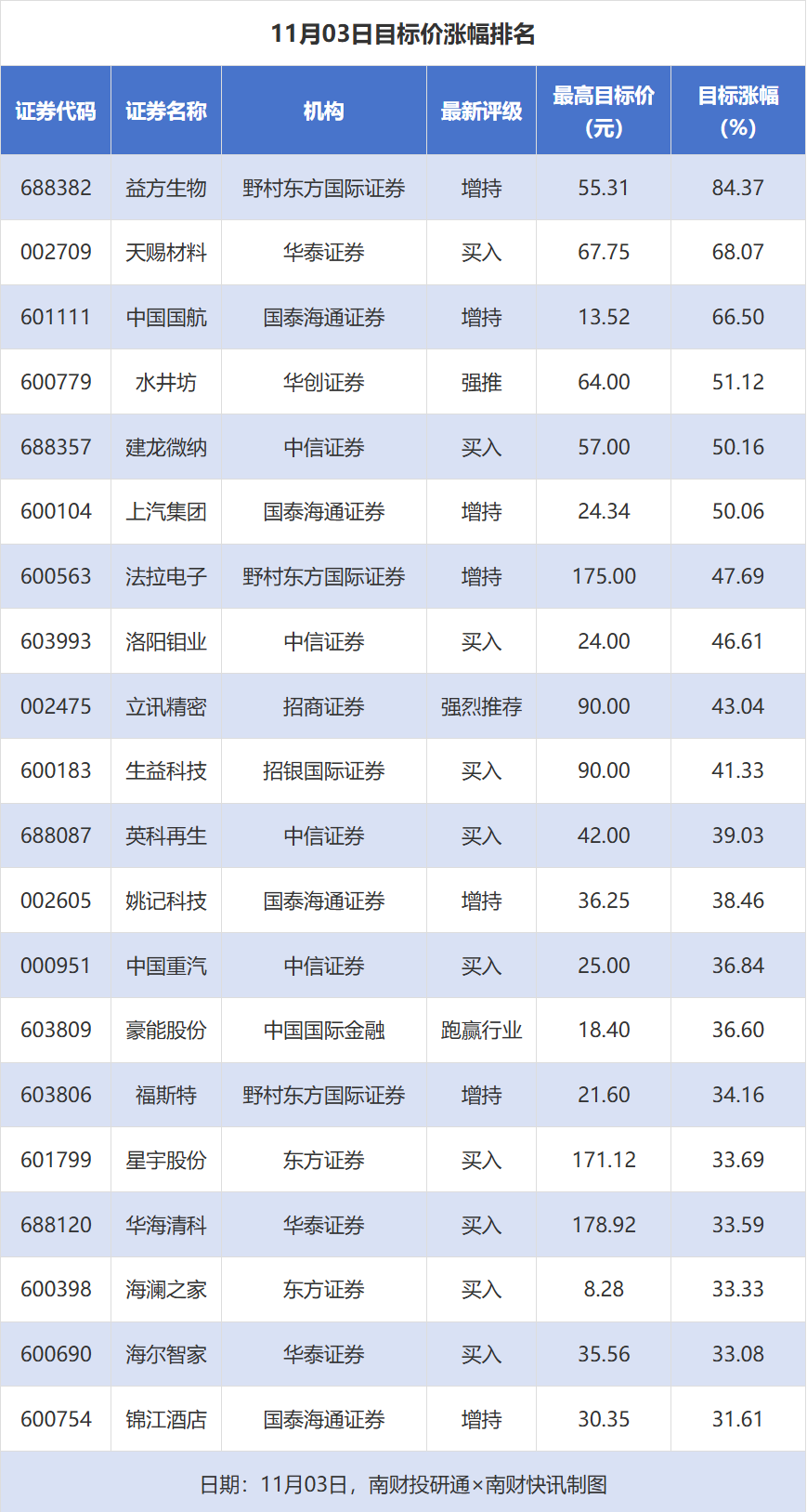 南财投研通数据显示专业提供股票配资,11月3日,券商给予上市公司目标价共100次,按最新收盘价计算,目标价涨幅排名居前的公司有益方生物、天赐材料、中国国航,目标价涨幅分别为84.37%、68.07%、66.50%,分别属于化学制药、电池、航空机场行业。